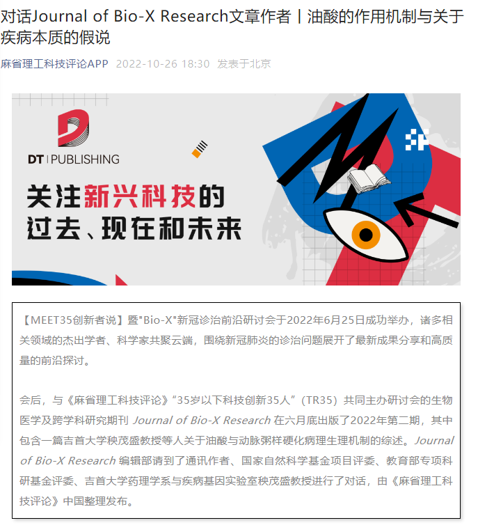本网讯(通讯员 成江)2022年10月26日,《麻省理工科技评论》中国公众号发表了对db真人体育官网秧茂盛教授的采访,该采访的主题是“对话Journal of Bio-X Research文章作者丨油酸的作用机制与关于疾病本质的假说”,重点报道了秧茂盛教授的最新研究成果以及未来的研究设想和计划。