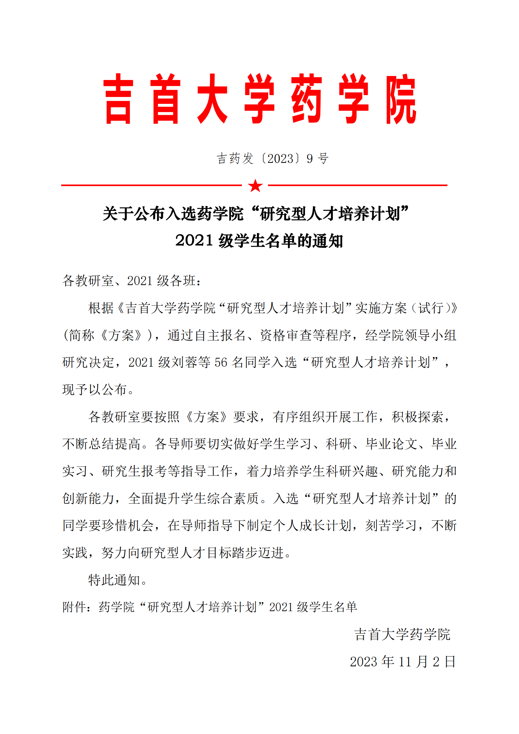 吉药发〔2023〕9号关于公布入选db真人体育官网“研究型人才培养计划”2021级员工名单的通知.pdf