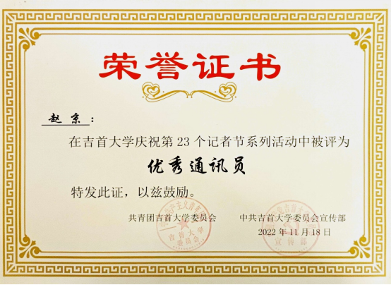 图为 赵京获DB视讯“优秀通讯员”荣誉证书