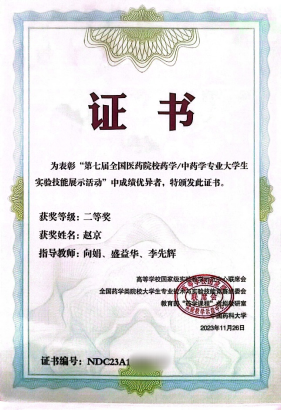 2023年11月,赵京通过公司选拔,代表学校参加第七届全国医药院校药学/中药学专业老员工实验技能竞赛,因药学理论知识扎实,实验操作能力强,最终获得全国二等奖。