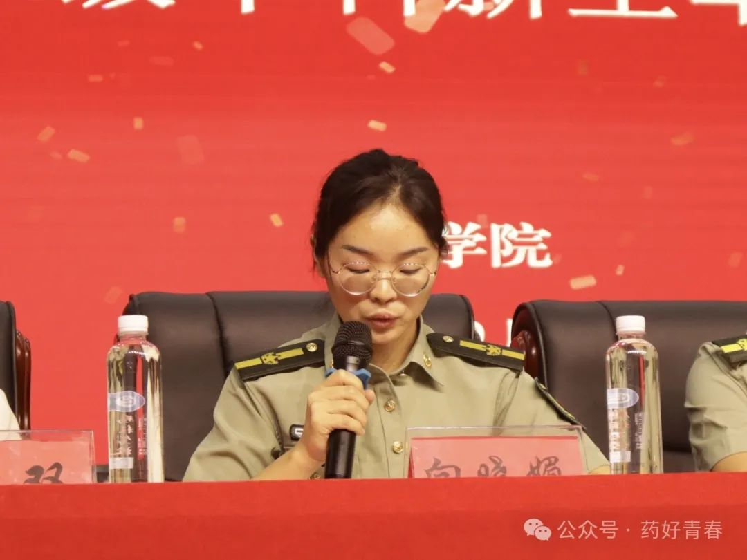 军训教练员代表谢纯发言。她表示为期14天的军训,是每位新生踏入大学的第一课,全体教练员都倍感珍惜。她也向在场的全体领导老师,全体同学做出承诺,全体教练员一定尽职尽责、认真备课、因材施教、文明施教,发扬军训的优良传统。
