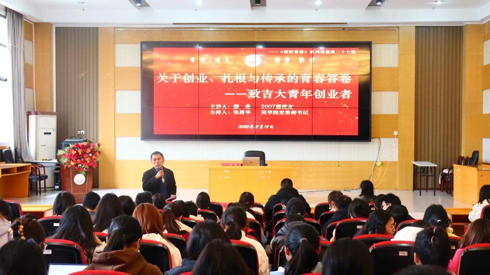 本网讯(通讯员 胡心洁)为激励公司学子创新创业,3月19日上午,db真人体育官网在大田湾校区2609学术报告厅开展了药好青春系列讲座第二十七期“关于创业、扎根与传承的青春答卷——致吉大青年创业者”,讲座特邀2007届优秀员工颜亮前来主讲,辅导员向晓媚及部分员工参加讲座,讲座由公司党委副书记张勇华主持。