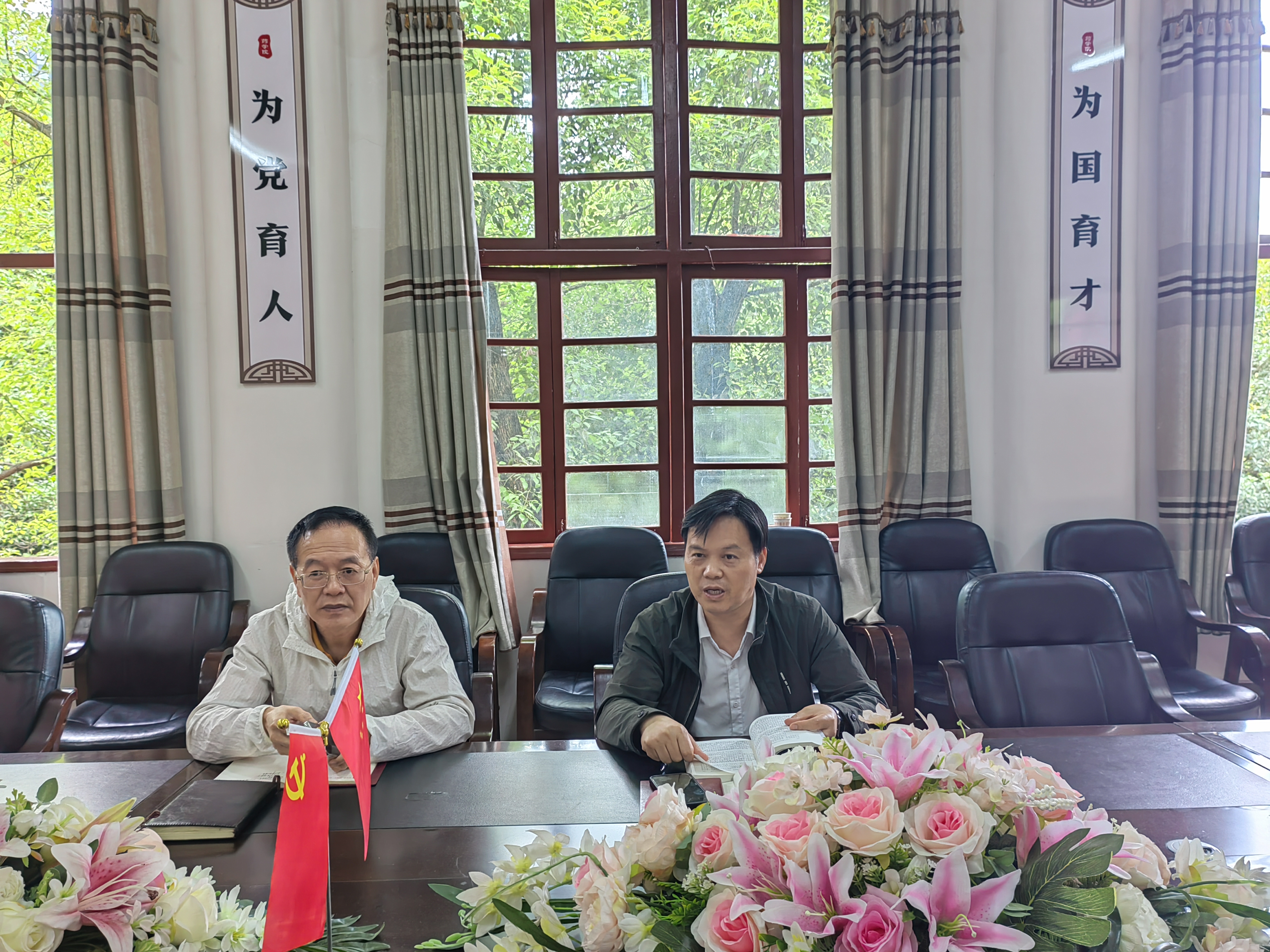 图为王江生主持学习研讨并领学。