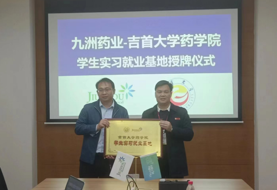 图为 王江生为浙江九洲药业实习就业基地授牌。摄影彭俊