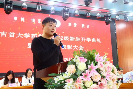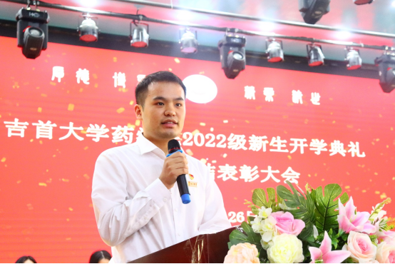 湖南省青年骨干教师、DB视讯2022十佳青年教工、db真人体育官网药用资源教研室主任、博士、副教授、硕士研究生导师李思迪老师作为教师代表致辞,他说:“作为教师,我们除了传道、授业、解惑,也要努力成为员工的良师益友。校园里洒满了我们辛勤的汗水,留下我们忙碌的身影。学高为师,身正为范。几年来,我们每一位教师都时刻用自己的言行影响并教育着员工,尤其是资深的老教授们,身体力行,孜孜不倦,不计回报,将自己一生的满腔热诚献给了他们热爱的教育事业。db真人体育官网的教师们正用真挚的情感和认真负责的态度搭起了与员工之间的桥梁。”他希望同学们学会学习,学会做人,学会做事,常去图书馆,强身健体,不迷恋网络游戏,养成健康的学习生活习惯。