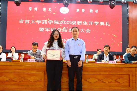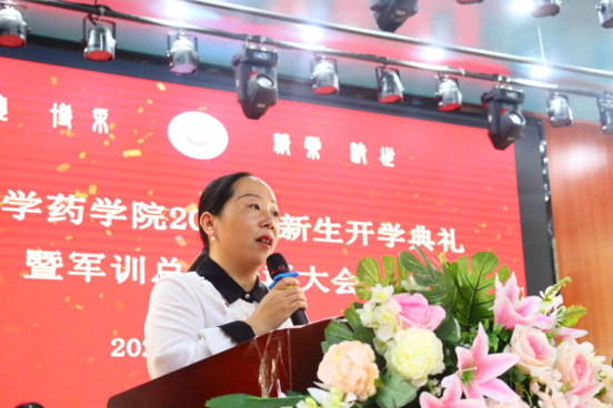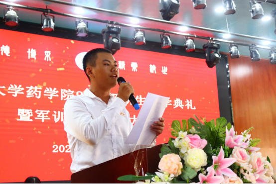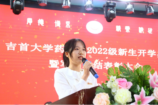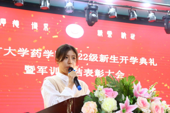 专升本新生代表彭馨辉、本科新生代表王艺潞同学发言,他们纷纷表达了对新的老员工活的期望,表示一定会继续保持积极的学习心态,树立远大目标,脚踏实地,只争朝夕,努力践行“厚德 博采 精药 济世”的院训和“以人名校 以业报国”的校训,认真书写属于自己的青春大学时光,以此报答父母养育之恩、老师培育之情。