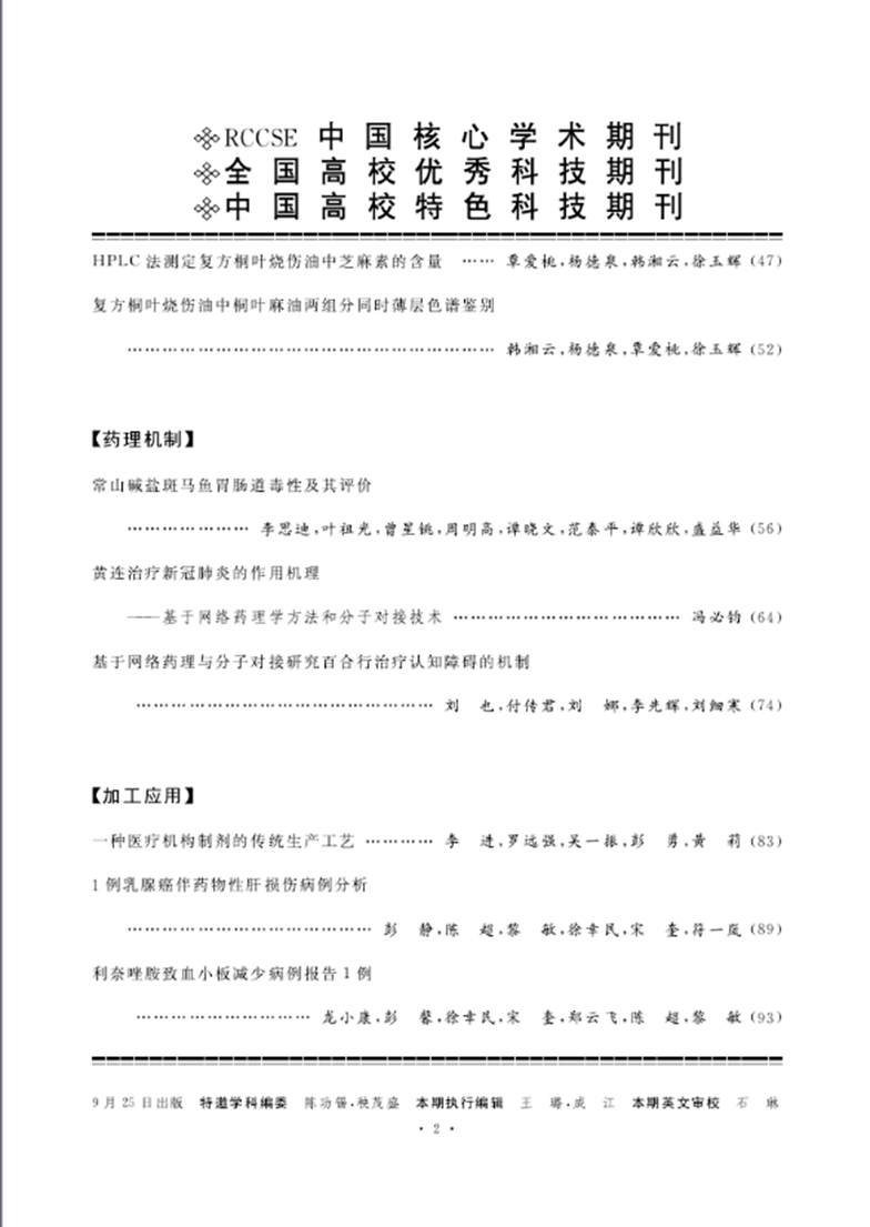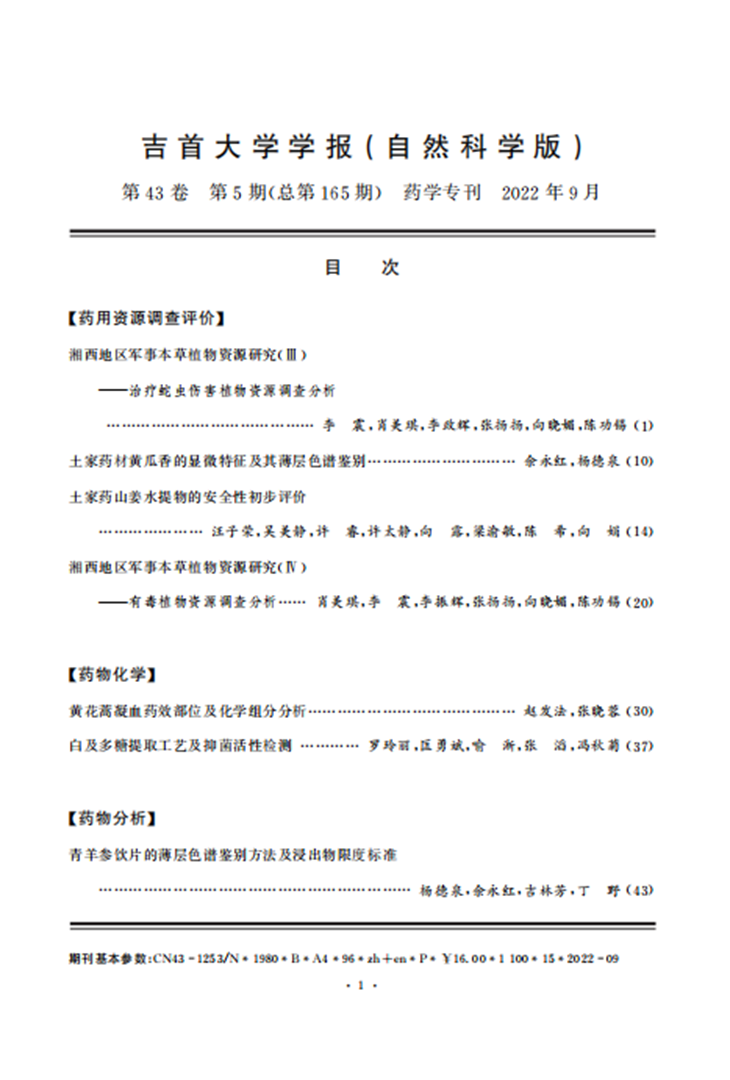 本专刊立足湘西地区丰富的药物资源,按药用资源、药物化学、药物分析、药理机制等五个专题,共刊登研究论文15篇,其中db真人体育官网师生8篇,合作单位湘西州食品药品检验所、湘西州人民医院、湘西州民族中医院共7篇。