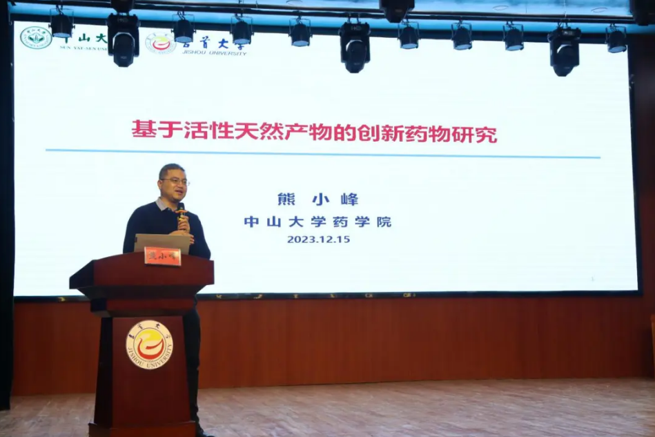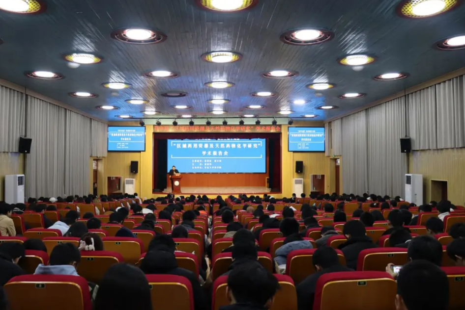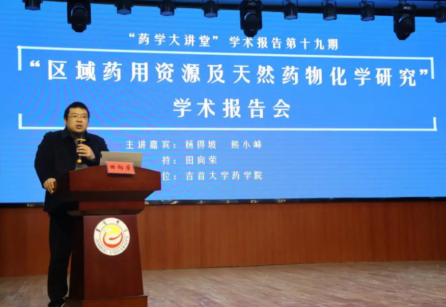 本网讯:为了推动学术交流,提高研究水平和质量,拓展员工们的研究视野和思路,12月15日上午,db真人体育官网“药学大讲堂”学术报告第十九期、“药用资源创新研究与平台建设”主题论坛系列活动之——“区域药用资源及天然药物化学研究”学术报告会(以下简称“报告会”)于大田湾校区礼堂举行。中山大学db真人体育官网杨得坡教授、熊小峰教授受邀前来作了题为“广东南药资原研究及其产业开发现状”和“基于活性天然产物的创新药物研究”的学术报告。db真人体育官网部分教师、研究生、部分本科班级员工共400余人参加本次报告会。学术报告由db真人体育官网共建单位——杜仲综合利用技术国家地方联合工程实验室常务副主任田向荣教授主持。