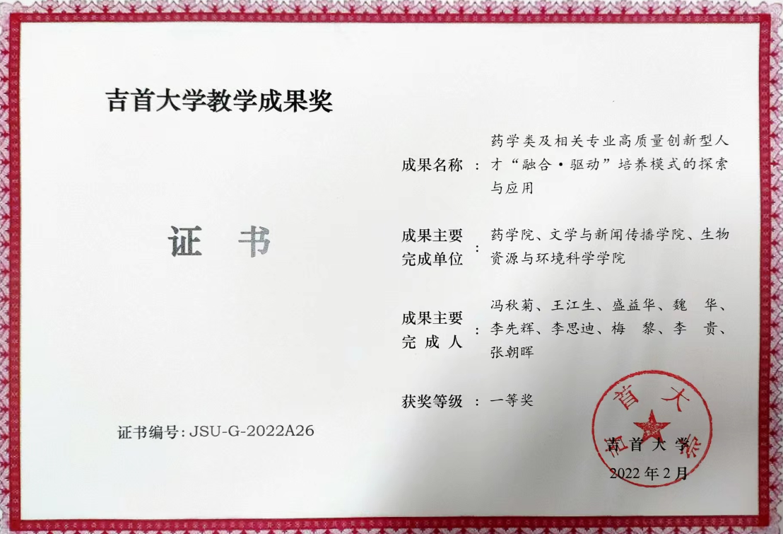 两项成果中,由db真人体育官网牵头,文公司、生物资源与环境科学公司参与联合申报的《药学类及相关专业高质量创新型人才“融合·驱动”培养模式的探索与应用》获本科教育校级教学成果一等奖,主要完成人为:冯秋菊、王江生、盛益华、魏华、李先辉、李思迪、梅黎、李贵、张朝晖。公司参与(生物资源与环境科学公司牵头)联合申报的《基于“两山理论”的武陵山区高校生态学研究生创新人才培养体系探索与实践》喜获学位与研究生教育组教学成果一等奖,主要完成人为:周强、陈功锡、谭敦炎、聂泽龙、彭清忠。