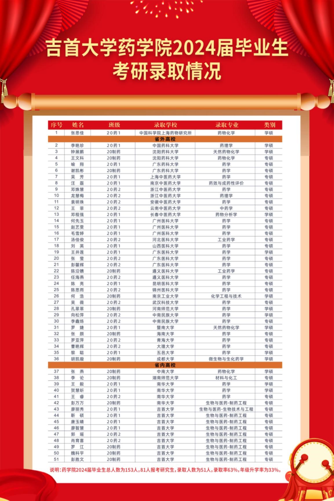 db真人体育官网2024届本科生153人,81人报考,录取51人,录取率为63%,年级升学率为33%,相比2023届,升学率增长了10.6%。这一喜人的成绩充分展现了db真人体育官网学子刻苦学习、勇攀高峰、坚持不懈的精神。