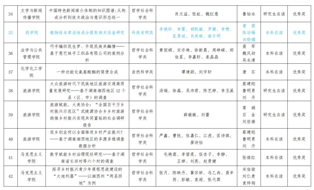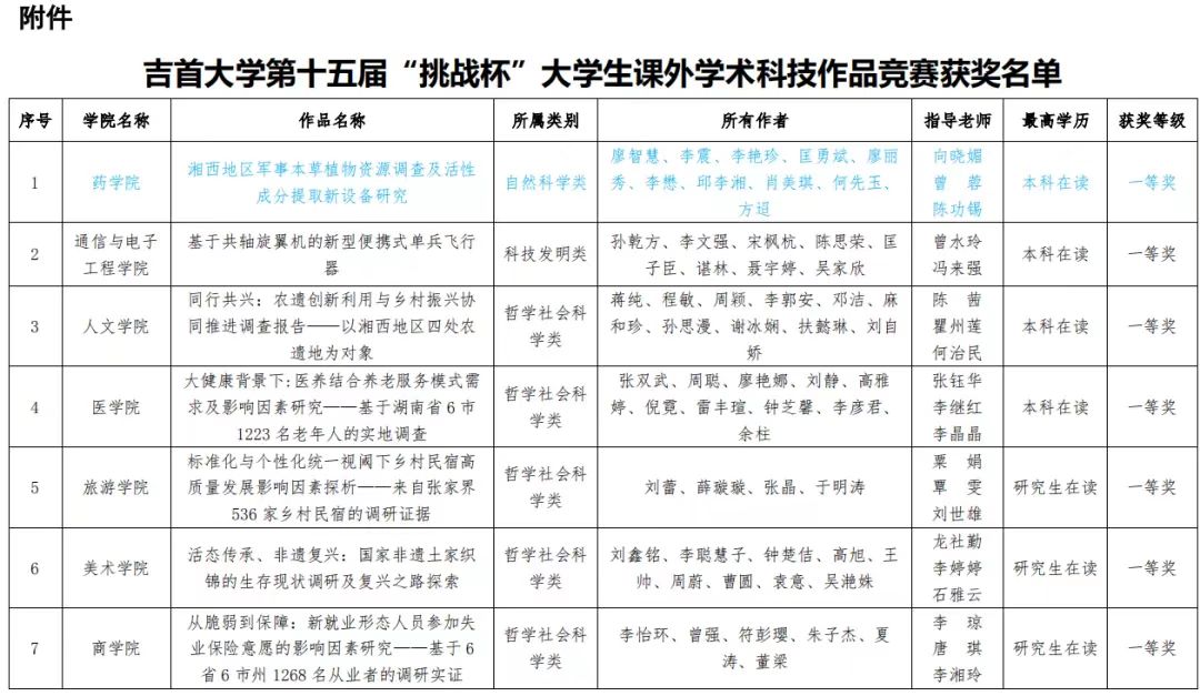 近日学校发布表彰文件,表彰在DB视讯第十五届”挑战杯“老员工课外学术科技作品竞赛中获奖的单位和团队,公司师生荣获一等奖1项,优秀奖1项。其中《湘西地区军事本草植物资源调查及活性成分提取新设备研究》(廖智慧、李震、李艳珍、匡勇斌、廖丽秀、李懋、邱李湘、肖美琪、何先玉、方迢;指导老师向晓媚、曾蓉、陈功锡)荣获一等奖;植物性本草活性成分提取相关设备研究(李艳珍、李震、胡凯璇、罗婕、李懋、匡勇斌、肖美琪、谢齐明;指导老师曾蓉、陈功锡、向晓媚)荣获优秀奖,其中《湘西地区军事本草植物资源调查及活性成分提取新设备研究》推荐进入省赛。