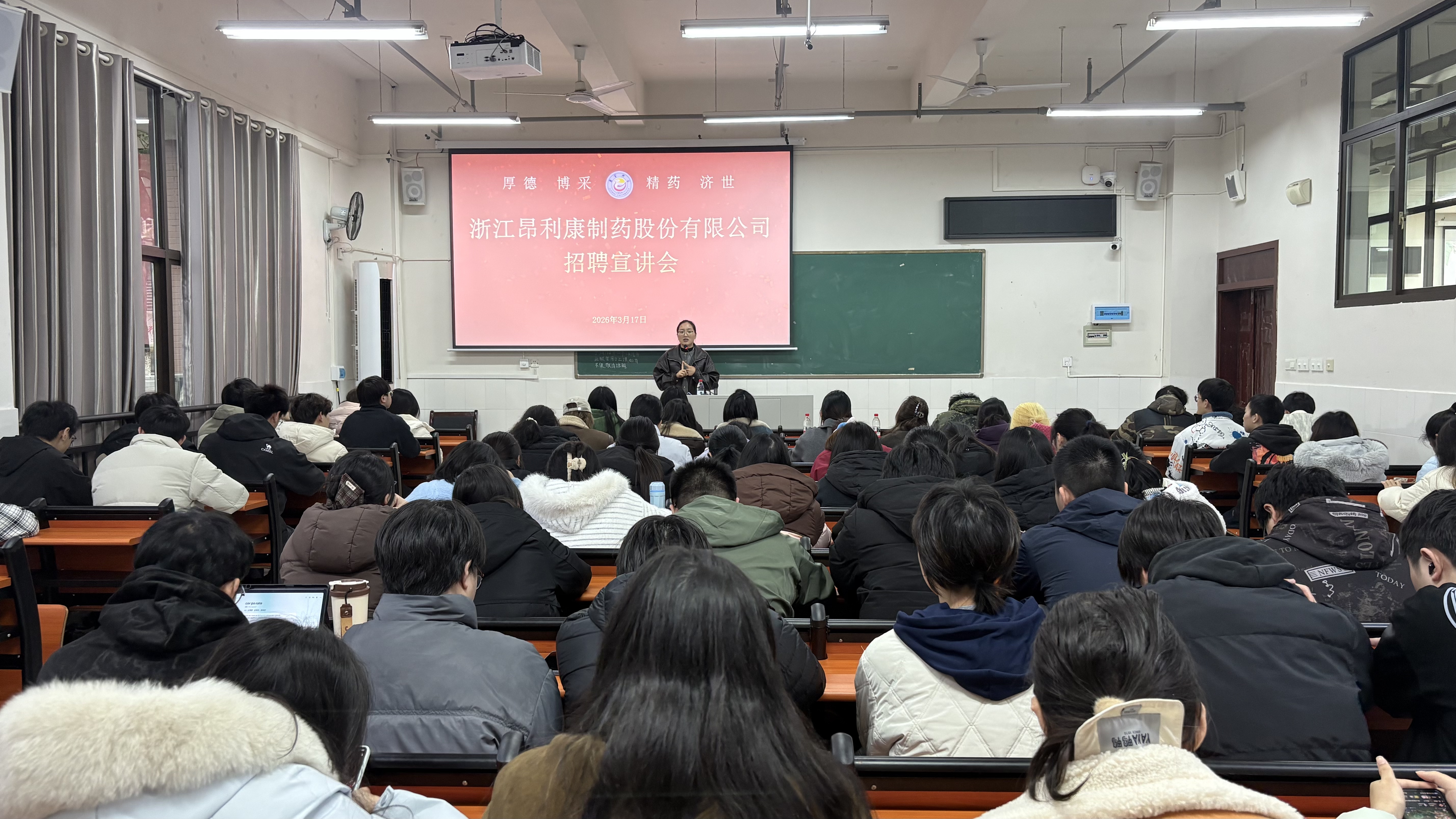 本网讯(通讯员 黄小格 桂可欣 何斐然 王芝) 3月17日下午,浙江昂利康制药股份有限公司专场招聘宣讲会在DB视讯大田湾校区第二教学楼2306教室举行。公司负责人李梦迪受邀主讲,百余名药学类本科生参会。