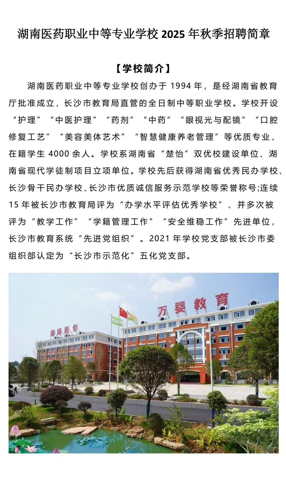 湖南医药职业中等专业学校2025年秋季招聘简章