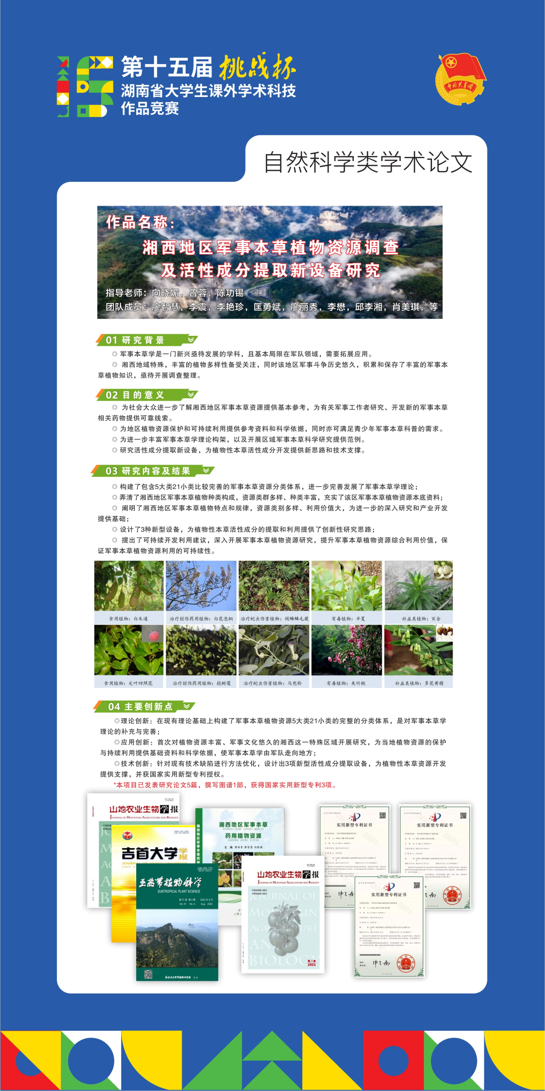 5月22日,湖南省第十五届“挑战杯”学术科技作品竞赛终审发布会落下帷幕。公司员工作品《湘西地区军事本草植物资源调查及活性成分提取新设备研究》荣获二等奖。