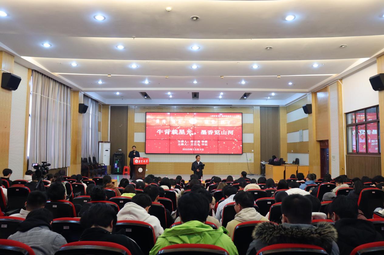 本网讯(通讯员 袁鑫雨 刘张井)12月2日下午,db真人体育官网“药好青春”立人教育讲座第33期在大田湾校区第二教学楼2609报告厅举行。央视《特别关注》总导演、制片人,香港文联作协副主席符云亮应邀回母校,以“牛背载星光 墨香览山河——湘西放牛娃的央视逆袭诗行”为题,讲述从放牛娃到央视导演的成长故事。讲座由王江生主持。