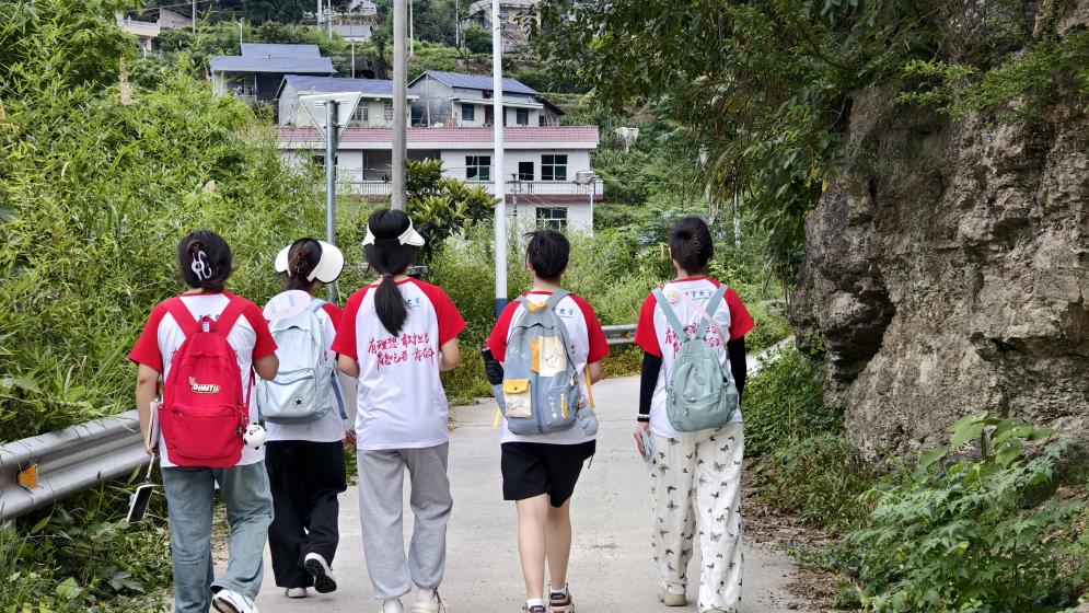 图为 志愿者走在去调研走访的路上