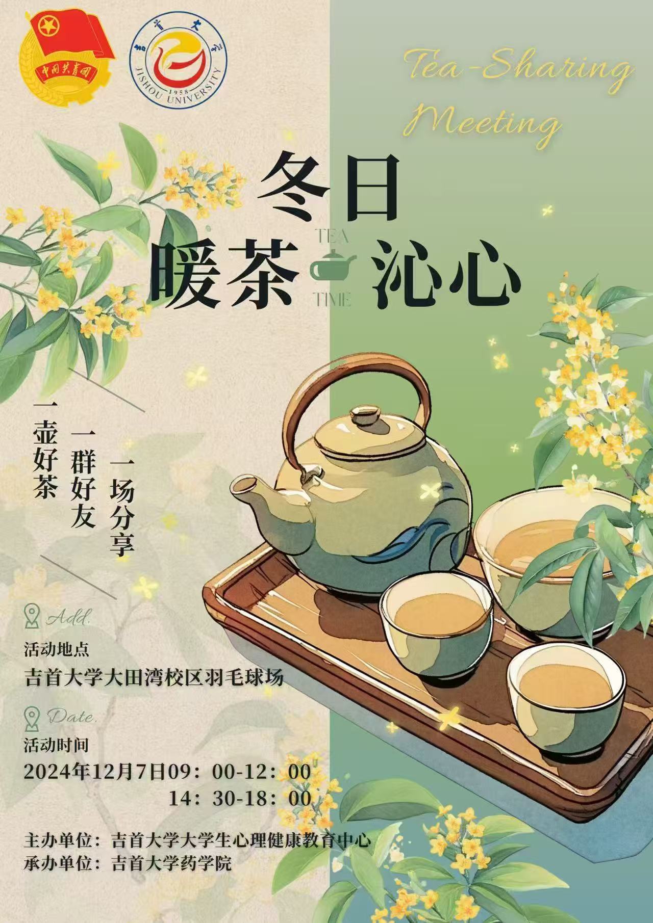 无论你是活泼的“显眼包”,还是内敛的倾听者,这里都有你的快乐天地。一起解决烦恼,憧憬未来,在2024年12月7日的DB视讯大田湾校区的羽毛球场,让暖茶沁润你的心灵。快来共赴这场冬日茶话会之约吧!