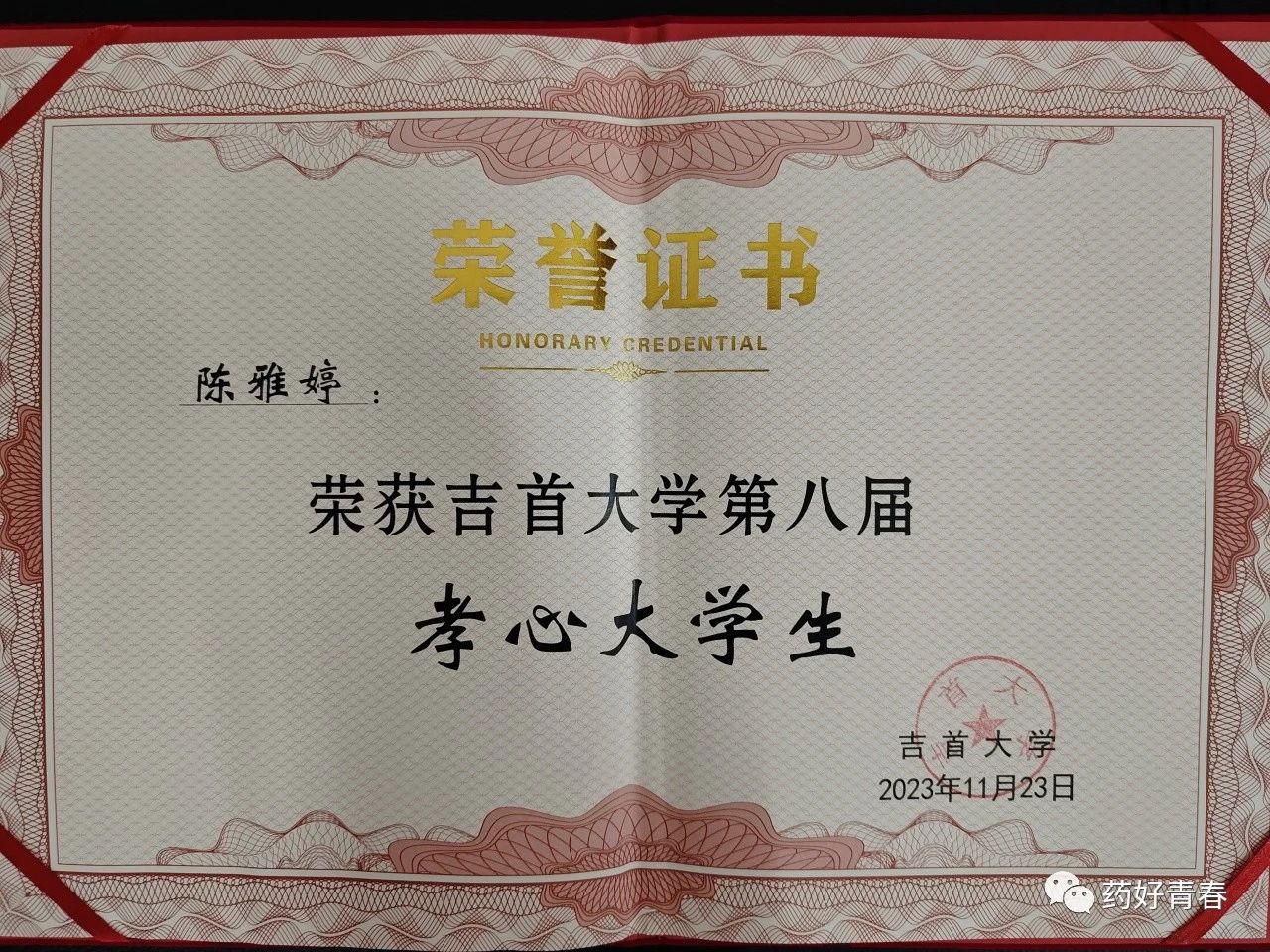 图为 陈雅婷获得孝心老员工荣誉证书