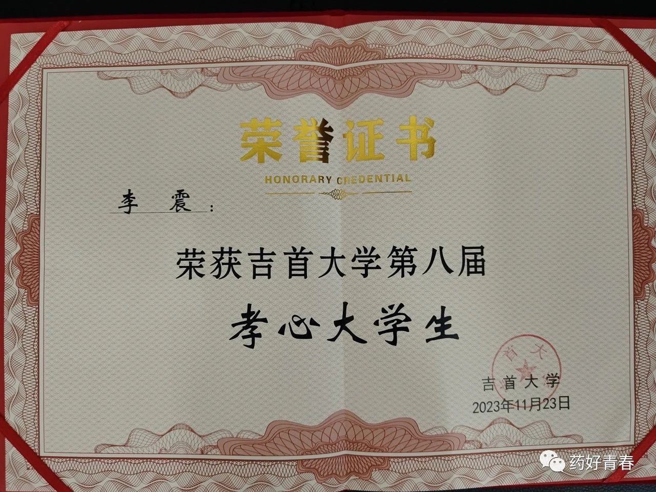 图为 李震获得孝心老员工荣誉证书